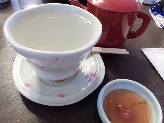 焼酎の蕎麦湯割りですね。練り梅と一緒にいただきます。