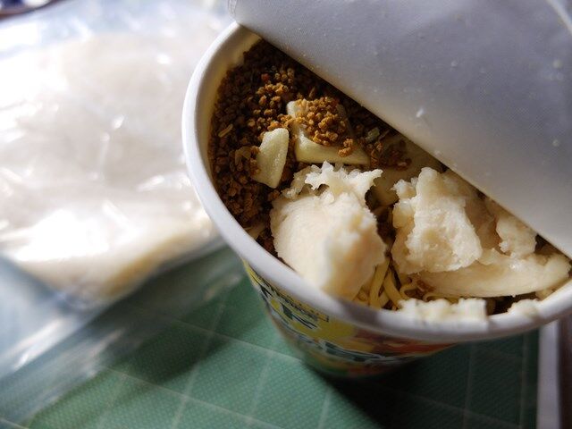 それをこのようにカップ麺に入れている、酒粕入りカップラーメン、