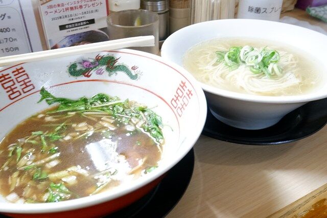 そして手前が麺を食べつくした丼。向こうが替え玉の入った