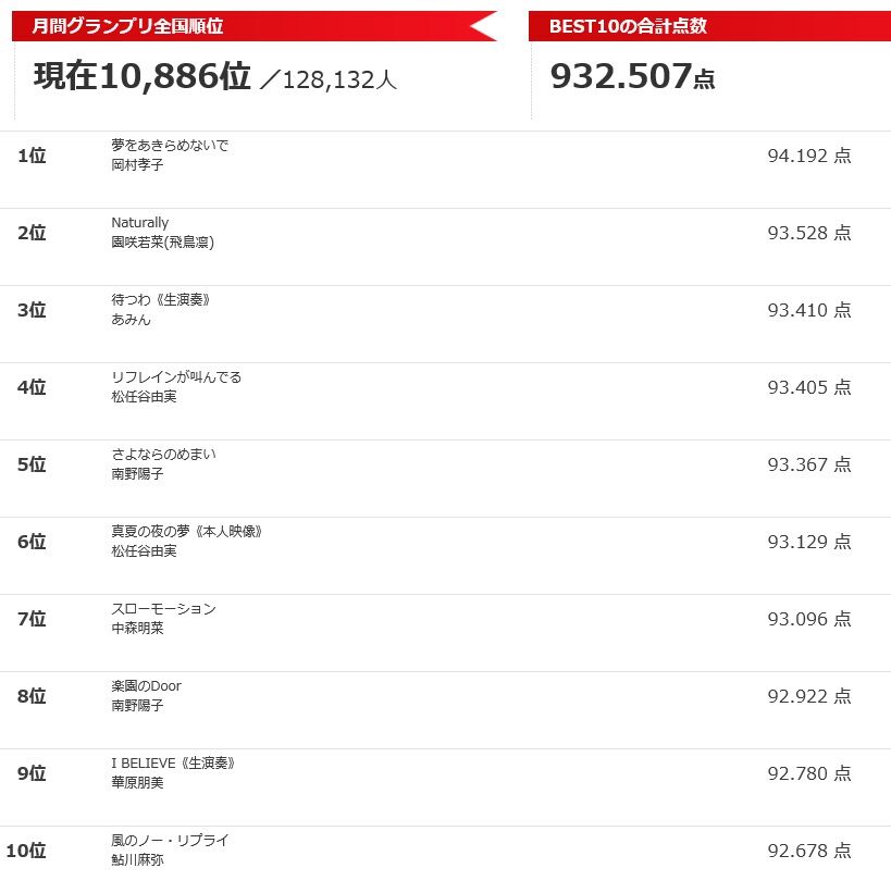 2016年10月27日 joysound 10月分 カテゴリ: こんにちは 結局今月は940点まで点数を伸ばすことができませんでした。いつもはもう少し点数を伸ばせられるはずのスローモーションなどで93点が取れなかったのが残念です。